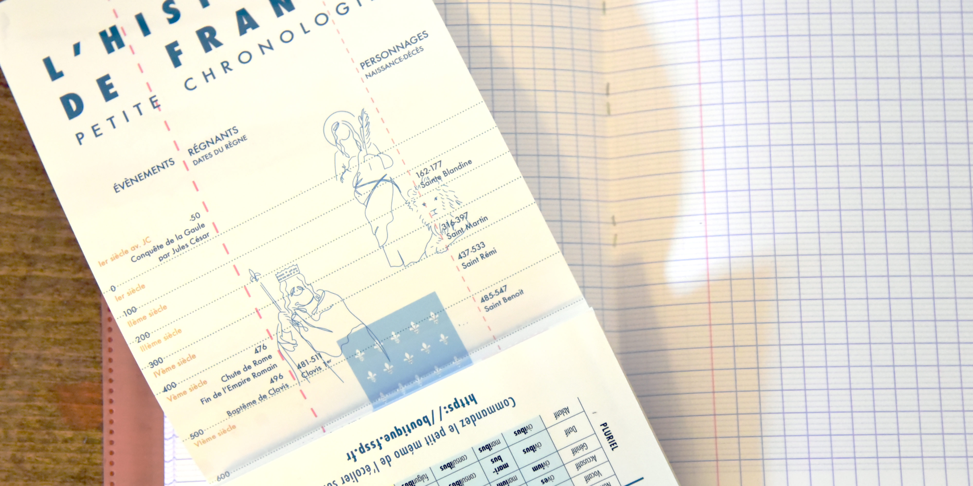 Au recto, une chronologie de l’histoire de France illustrée. Succincte et claire, elle permet de repérer les grandes périodes avec des personnages marquants de notre histoire.